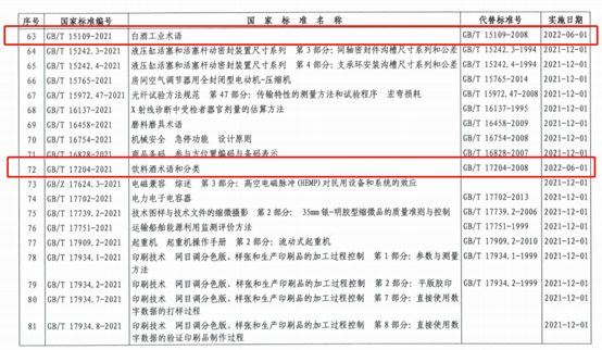 國家標(biāo)準(zhǔn)化管理委員會(huì)于2021年5月21日發(fā)布“2021年第7號(hào)中國國家標(biāo)準(zhǔn)公告”,GB/T 15109-2021《白酒工業(yè)術(shù)語》及GB/T 17204-2021《飲料酒術(shù)語和分類》兩項(xiàng)國家標(biāo)準(zhǔn)正式發(fā)布,實(shí)施日期為2022年6月1日。中國食品院承擔(dān)的白酒標(biāo)委會(huì)秘書處及釀酒標(biāo)委會(huì)秘書處隨后將針對(duì)新發(fā)布的兩項(xiàng)國家標(biāo)準(zhǔn)開展深入解讀工作。