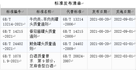 其中,由中國食品發(fā)酵工業(yè)研究院有限公司所屬全國食品工業(yè)標(biāo)準(zhǔn)化技術(shù)委員會歸口修訂的GB/T 13214-2021《牛肉類、羊肉類罐頭質(zhì)量通則》、GB/T 14215-2021《番茄醬罐頭質(zhì)量通則》及GB/T 24402-2021《鯪魚罐頭質(zhì)量通則》;由全國白酒標(biāo)準(zhǔn)化技術(shù)委員會歸口修訂的GB/T 10781.9-2021《白酒質(zhì)量要求 第9部分:芝麻香型白酒》四項推薦性國家標(biāo)準(zhǔn)正式發(fā)布。