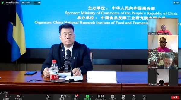 2021年9月6日,由國(guó)家商務(wù)部主辦、中國(guó)食品發(fā)酵工業(yè)研究院承辦的“巴哈馬農(nóng)副產(chǎn)品生產(chǎn)加工管理研修班”成功舉辦了線上開(kāi)班儀式。中國(guó)駐巴哈馬特命全權(quán)大使戴慶利、巴哈馬農(nóng)業(yè)與海洋資源部常務(wù)秘書(shū)(副部級(jí))喬爾·劉易斯、食品院總經(jīng)理董建輝、中國(guó)駐巴哈馬經(jīng)濟(jì)商務(wù)參贊樊金科出席了開(kāi)班儀式,食品院總經(jīng)理助理羅燕琴主持開(kāi)班儀式。