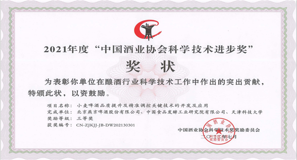 近期,中國(guó)酒業(yè)協(xié)會(huì)召開第六屆理事會(huì)第四次擴(kuò)大會(huì)議。會(huì)上,中國(guó)食品發(fā)酵工業(yè)研究院有限公司聯(lián)合百威亞太控股有限公司《啤酒制造業(yè)碳中和關(guān)鍵技術(shù)的研究與應(yīng)用》項(xiàng)目成果榮獲2021年度中國(guó)酒業(yè)協(xié)會(huì)科學(xué)技術(shù)進(jìn)步二等獎(jiǎng);中國(guó)食品院聯(lián)合北京燕京啤酒股份有限公司、天津科技大學(xué)《小麥啤酒品質(zhì)提升及精準(zhǔn)調(diào)控關(guān)鍵技術(shù)的開發(fā)與應(yīng)用》項(xiàng)目成果榮獲2021年度中國(guó)酒業(yè)協(xié)會(huì)科學(xué)技術(shù)進(jìn)步三等獎(jiǎng)。