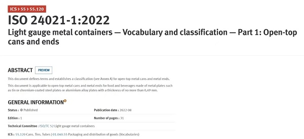 2022年8月26日,由中國(guó)食品發(fā)酵工業(yè)研究院有限公司聯(lián)合國(guó)內(nèi)相關(guān)企事業(yè)單位研制的ISO 24021-1:2022 Light gauge metal containers — Vocabulary and classification — Part 1: Open-top cans and ends《薄壁金屬容器-詞匯和分類-第1部分:開頂罐和蓋》國(guó)際標(biāo)準(zhǔn)正式發(fā)布,該標(biāo)準(zhǔn)是我國(guó)主導(dǎo)完成的第二項(xiàng)薄壁金屬容器領(lǐng)域國(guó)際標(biāo)準(zhǔn)。