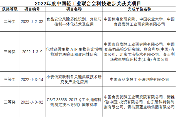 2023年4月11日,在中國輕工業聯合會2022年度科技進步獎表彰中,中國食品發酵工業研究院聯合中國標準化研究院及中國農業大學的科技成果《食品安全多維識別、分級與控制一體化技術及應用》榮獲2022年度中國輕工業聯合會科技進步二等獎,中國食品院牽頭的三項科技成果《小麥低聚肽制備關鍵集成技術研究及產業化應用》、《化妝品微生物ATP生物熒光增幅檢測方法驗證和適用性研究》、《GB/T 35538-2017<工業用酶制劑測定技術導則>國家標準》分別榮獲科技進步三等獎,項目成果涉及食品安全風險控制、標準制修訂、功能肽研發和微生物檢測方法等領域。