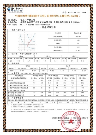 《食品與發(fā)酵工業(yè)》由中國食品發(fā)酵工業(yè)研究院主辦,創(chuàng)刊于1970年。多次榮獲“中國百種杰出學(xué)術(shù)期刊獎”“中國精品科技期刊”等稱號;連續(xù)兩年被評為《科技期刊世界影響力指數(shù)WJCI》食品科學(xué)技術(shù)類Q1區(qū)學(xué)術(shù)期刊,并成功入選《食品科學(xué)與工程領(lǐng)域高質(zhì)量科技期刊分級目錄》T1類,是中國科學(xué)引文數(shù)據(jù)庫(CSCD)核心期刊、中文核心期刊、中國科技核心期刊。
