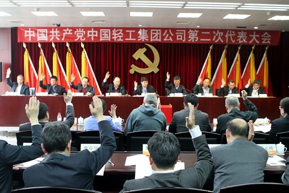 代表們舉手表決通過大會(huì)《中國(guó)共產(chǎn)黨中國(guó)輕工集團(tuán)公司第二次代表大會(huì)選舉辦法》