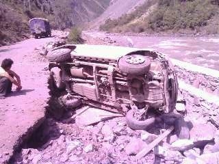 彭云:有天中午,我們從夾壁鄉(xiāng)衛(wèi)生院巡查完趕去另一個(gè)工地,兩個(gè)工地之間有一段未完工的317國(guó)道路基。受地震影響,道路遭受嚴(yán)重的破壞,兩邊山上時(shí)有滾石掉下。車在顛簸、搖晃中緩慢行駛,過了畢棚溝路口的小橋后是一個(gè)急轉(zhuǎn)彎。突然,前面從山上滾下一根木頭橫在車前,司機(jī)劉定峰大喊一聲“壞了!”,瞬間車子跳起來,劇烈搖晃,我下意識(shí)抱住了頭,身體在車內(nèi)左右撞擊,周圍的東西在搖晃,車在旋轉(zhuǎn),十幾秒鐘以后,一切戛然停止。我們又怔了十幾秒,“大家沒事吧?”我們異口同聲問道,我試著動(dòng)了動(dòng)四肢,沒受傷,其他人也都沒有受傷。在附近目睹這驚險(xiǎn)場(chǎng)面的工友們?nèi)颗苓^來拉我們出去。從車子里出來后,我們發(fā)現(xiàn)側(cè)翻車輛離河邊只有兩米!也要感謝劉定峰,在車摔到坑里前他死死的抓住方向盤,踩著剎車,避免了更大的險(xiǎn)情發(fā)生。