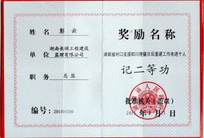2011年,湖南省政府授予長(zhǎng)順項(xiàng)目管理有限公司湖南省對(duì)口支援四川理縣援建先進(jìn)單位的光榮稱號(hào)。由長(zhǎng)順公司承監(jiān)三湘大道、商貿(mào)中心等項(xiàng)目獲四川天府杯金獎(jiǎng),理縣中學(xué)項(xiàng)目獲四川天府杯銀獎(jiǎng)。講述者彭云榮獲湖南省政府頒發(fā)的二等功勛章和獎(jiǎng)狀,并獲邀參加湖南省委省政府領(lǐng)導(dǎo)接見表彰。