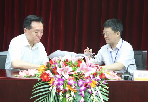集團公司總經理俞海星與食品發酵院院長蔡木易簽訂任務合同書