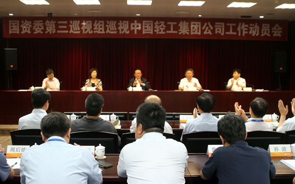 根據國務院國資委黨委統一部署,國資委第三巡視組近日進駐中國輕工集團公司(以下簡稱中輕集團)開展巡視。7月1日上午,國資委第三巡視組巡視中輕集團工作動員會召開。國資委第三巡視組組長韓修國就巡視工作作了講話,國資委巡視工作領導小組成員、巡視辦主任阮國平就配合做好巡視工作提出要求。中輕集團黨委書記、董事長陳鄂生主持會議并作表態發言。國資委第三巡視組副組長于學范、巡視組全體成員,國資委巡視辦有關人員出席會議。