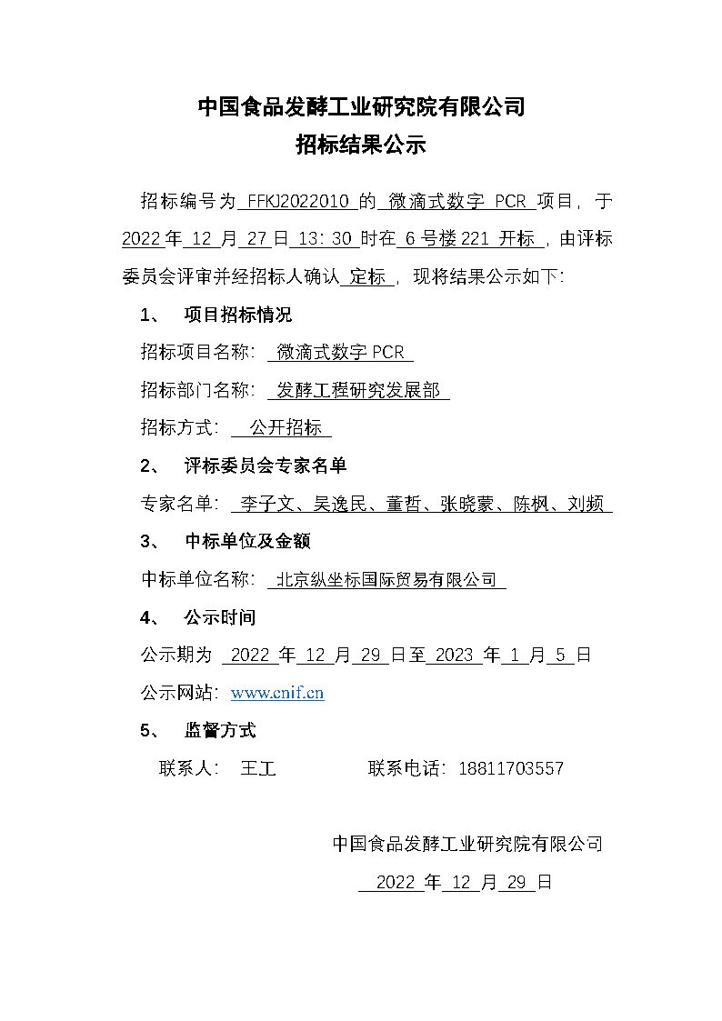 招標(biāo)結(jié)果公示——微滴氏數(shù)字PCR(招標(biāo)編號(hào):FFKJ2022010)