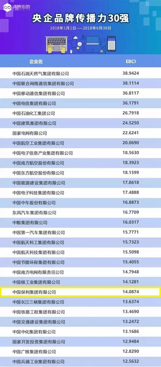 日前,2018上半年中央企業(yè)品牌傳播力榜單(簡稱“榜單”)新鮮出爐,保利集團(tuán)入圍三十強(qiáng),位列第23位。