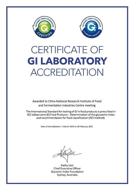中國食品發酵工業研究院長期從事食品的血糖生成指數(Glycemic index, GI)值研究,積累了豐富的測試與產品開發經驗。2018年,在澳大利亞悉尼大學血糖指數研究服務中心(Sydney University Glycemic Research Service, SUGiRS)及澳大利亞GI基金會專業技術指導及研究支持下,食品院成立了國內首家GI基金會認證的國際GI測試實驗室。在2020年,獲得澳大利亞悉尼大學GI國際數據庫中國地區獨家版權。